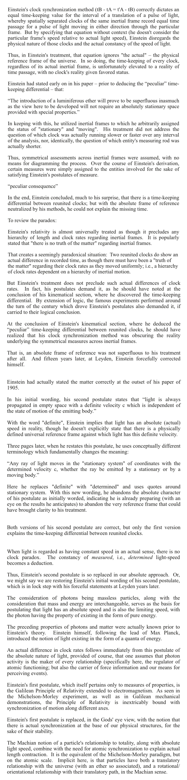 A short snippet from: Symmetry of Measure in Special RelativityRoger Luebeck © 2008, 2011, 2024 See my article: Symmetry of measure in relativity Also see my tutorial for computing non-kinematical and kinematical time-keeping dilation, with commentary on the Hafele-Keating study of circumnavigating jets: time-dilation.pdf Actual kinematical clock-rate slowing and actual length-contraction, dependent on actual speed as a percentage of the actual speed of light, are what produces: independent of inertial frame There can be no time-keeping differential without an underlying structure (totality) imparting physical properties. The all-encompassing absolute nature of light (energy, broadly) -- from which matter is born -- is the ultimate frame of reference. My articles and my book Relativity Trail explain and diagram symmetry of measure in absolute terms. Relativity Trail is completely consistent with Einstein's kinematical treatment. It reveals what is transpiring behind the scenes of Einstein's kinematical treatment. Einstein's clock synchronization is diagrammed in absolute terms. Einstein, himself, ultimately forcefully argued that the structure of space (totality) imparts inertial properties and provides us with standards for measure -- specifically -- standards for clocks and measuring rods, and dictates the effects of special relativity. He stated: "Space without ether is unthinkable". See the bottom of this document for a link to his lecture at Leyden. A snippet from Symmetry of Measure in Relativity: Replacing Einstein's postulates --