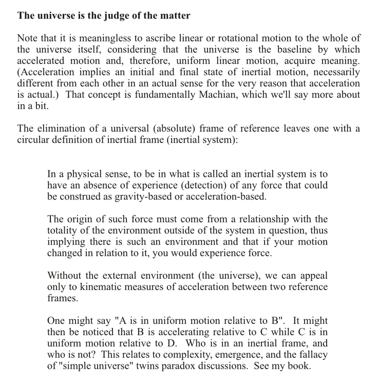 The fallacy of strict relativism in relativityRoger Luebeck © 2008, 2011, 2024 10/17/2025 Recall that the absolute approach to special relativity reveals the same thing that the relative approach assumes -- that there is no privileged frame of reference in which to conduct experiments. In this snippet from my article "Understanding what generates symmetry of measure and the time differential in special relativity", we see that a strictly relativist approach to the twins paradox mirrors the strict relativist's failure to grasp the true nature of an inertial frame in a consistent manner. A short ways into this snippet we see John A. Wheeler, Richard Feynman, Lucas & Hodgson, Edward Lowry, Richard Wolfson and Michio Kaku all fail in their attempts to resolve the twins paradox. That is status-quo throughout the literature -- text books and otherwise. Begin snippet: |